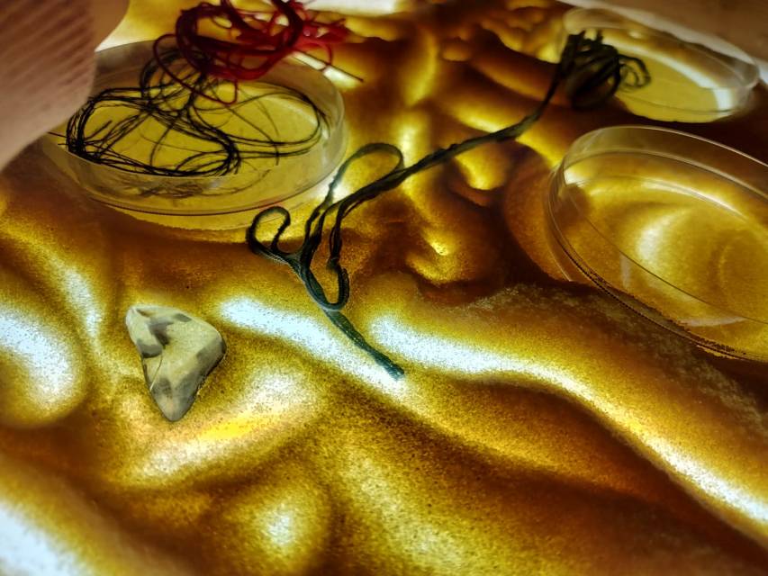 Sabbia dorata illuminata dal basso. I bambini disegnano con le dita, poi dispongono fili di lana colorata sulla sabbia. Creano, cancellano, ricreano. Niente da salvare, solo processo. Molto meditativo.