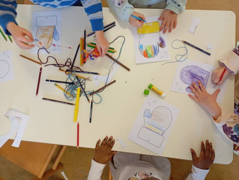 I bambini hanno lavorato con guanti-muffola di CARTA bianco come base per un'attività manipolativa centrata sulla lana. Ogni bambino ha decorato il proprio guanto incollando pezzi di lana di colori, spessori e texture diverse: lana grossa, lana sottile, lana bouclé, lana morbida.